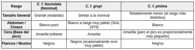• La Cera Amarilla: Es el rasgo más fácil para identificar a la hembra de C. f. pinima en campo, ya que las otras dos subespecies tienen la base del pico oscura.