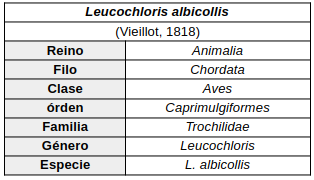 Picaflor de garganta blanca | Taxonomía Trochilidae Picaflor garganta blanca Taxonomía Descripción Comportamiento Distribución Conservación Bibliografía Monotípico Protónimo: «Trochilus albicollis»