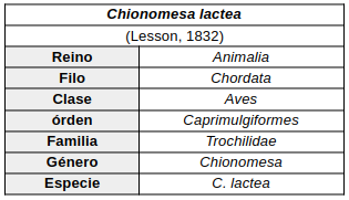 - Chionomesa lactea bartletti (Gould, 1866) – Este de Perú, Norte de Bolivia, y adyacente Oeste de Brasil; dudosa en extremo Este de Ecuador.