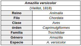 NOTA TAXONÓMICA: La Amazilia versicolor pertenece a uno de los géneros que se encuentra filogenéticamente más cercano a las especies de Hylocharis. Schuchmann (1999) sacó a la luz nuevamente el género Agyrtria para estas especies, lo que no ha sido aprobado por SACC. Según el Comité de Clasificación de Sudamérica, de la Asociación Americana de Ornitología, se la seguirá reconociendo como Amazilia, hasta que se publiquen datos que soporten la fragmentación del género. (Remsen, Areta, Cadena, Claramunt, Jaramillo, Pacheco, Robbins, Stiles, Stotz & Zimmer, 2018)