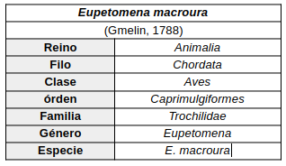 La mayoría de las autoridades clasifican esta especie como monotípica, en el género Eupetomena, aunque algunos la colocan en el género Campylopterus basados en los cantos y en el espesor de los ejes de las primarias de los machos Chébez et al., (2006) concluyen: En cuanto al uso del género monoespecífico Eupetomena -Gould,1849-61-para la especie, seguimos el criterio conservador adoptado por Remsen et al. (2005), a pesar de que Schuchmann (1999) la incluyó en el género Campylopterus -Swainson,1827- junto con otras tres especies, basándose en similitudes del canto y la morfología alar, que no fueron a nuestro entender claramente demostradas. (p. 50)
