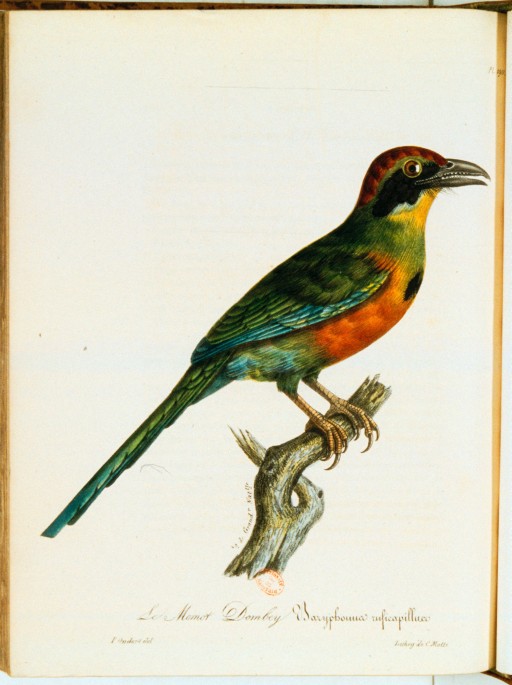 © La galerie des oiseaux. Vieillot, L. P., (1825).  Vol II: Ilustración 190.  (Le momot Dombey – Baryphonus ruficapillus)