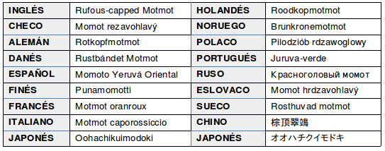 Nombres comunes: Yeruvá (Argentina, Bolivia y Paraguay); Taragón rojizo (Honduras); Burgo rojizo, Momoto yeruvá oriental; Jeruva, Juruva, Juruva-verde; (Brasil) Bururuk, (Botocudo), Jeruva, Pururu, Formigão (Bahía), Juruva-verde? En Goiás es simpátrico con Momotus momota (Burgo) (Sick, 1997:477); En guaraní: «Jiru, Marakana yvyguy», Yirú, marakaná-ihvihgwíh, guirá-hú-tacuara, güirá-payé, güirá-ivigüí, güirá-hú-ivigüí, yakú-tacuara o loro-ybuibui, yeruvá o lorito güí-güí”. Otros: Burgo cola recta, maracaná del suelo, papagayo de la barranca, tutú (de la Peña, 2020:24; Chébez, 1996:137).